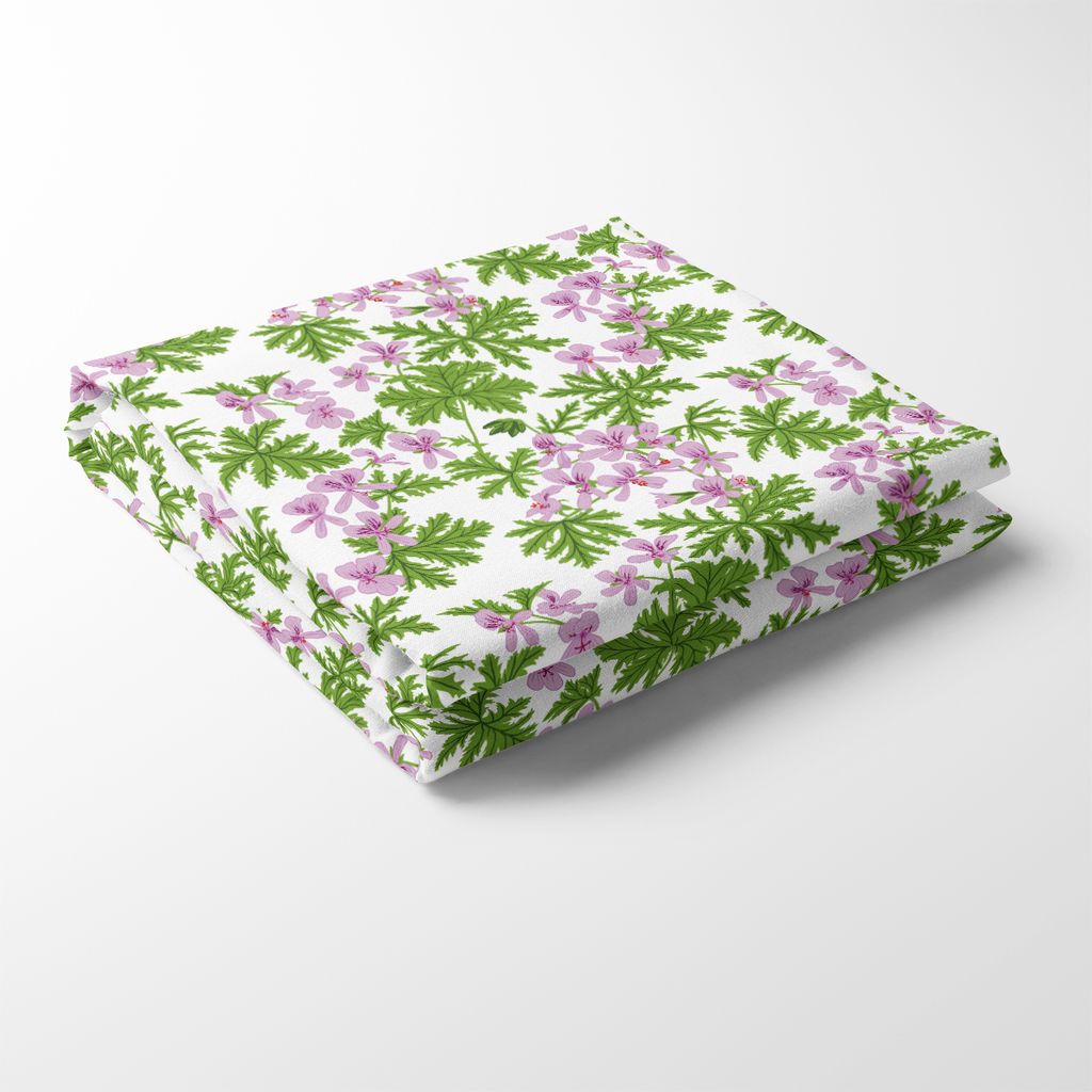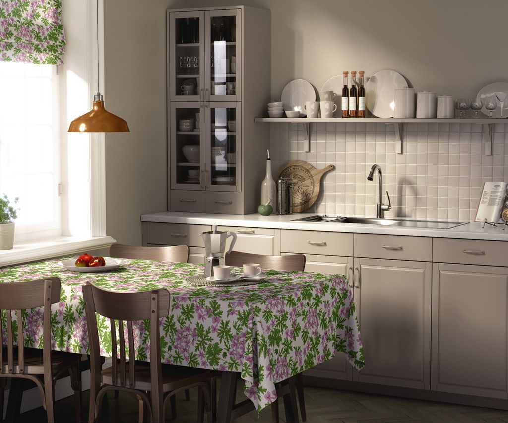 En vacker bordsduk med ett mjukt mönster av blomstrande pelargoner i lila och gröna toner. En tidlös design som ger din matplats en fräsch och inbjudande känsla. Duken finns i 4 olika storlekar.