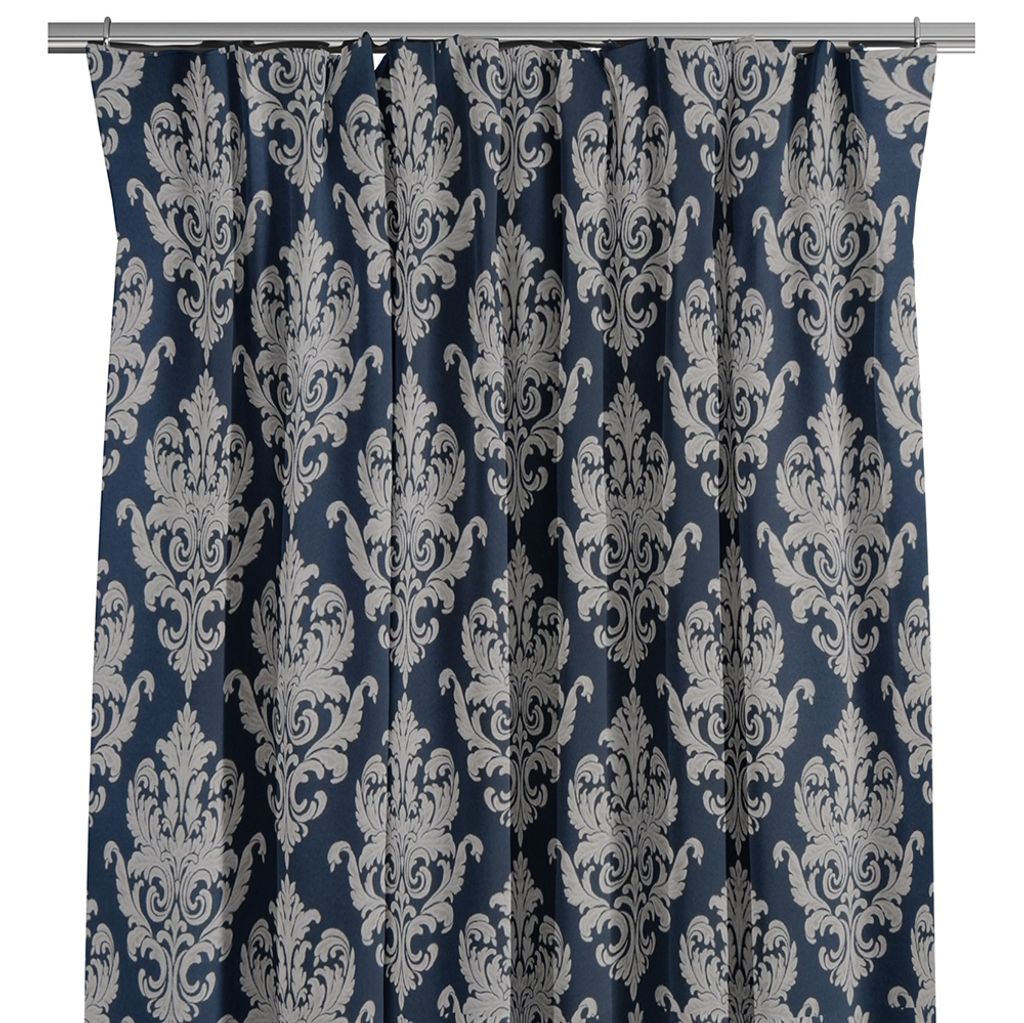Stilgardiner med blå botten och beige medaljonger en overlocksöm nertill.
