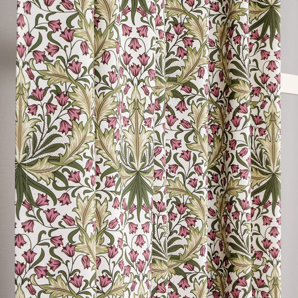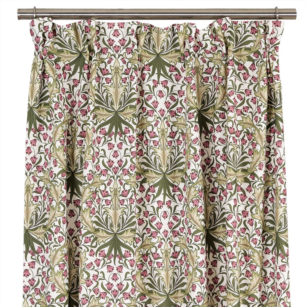 Willow Bloom gardinlängd är en hyllning till klassisk formgivning inspirerad av Arts and Crafts-rörelsens mönsterrika arv. Det täta, symmetriska blomstertrycket med slingrande blad, klockblommor i dämpade rosa toner och stiliserade grönska ger gardinen ett levande men harmoniskt intryck.