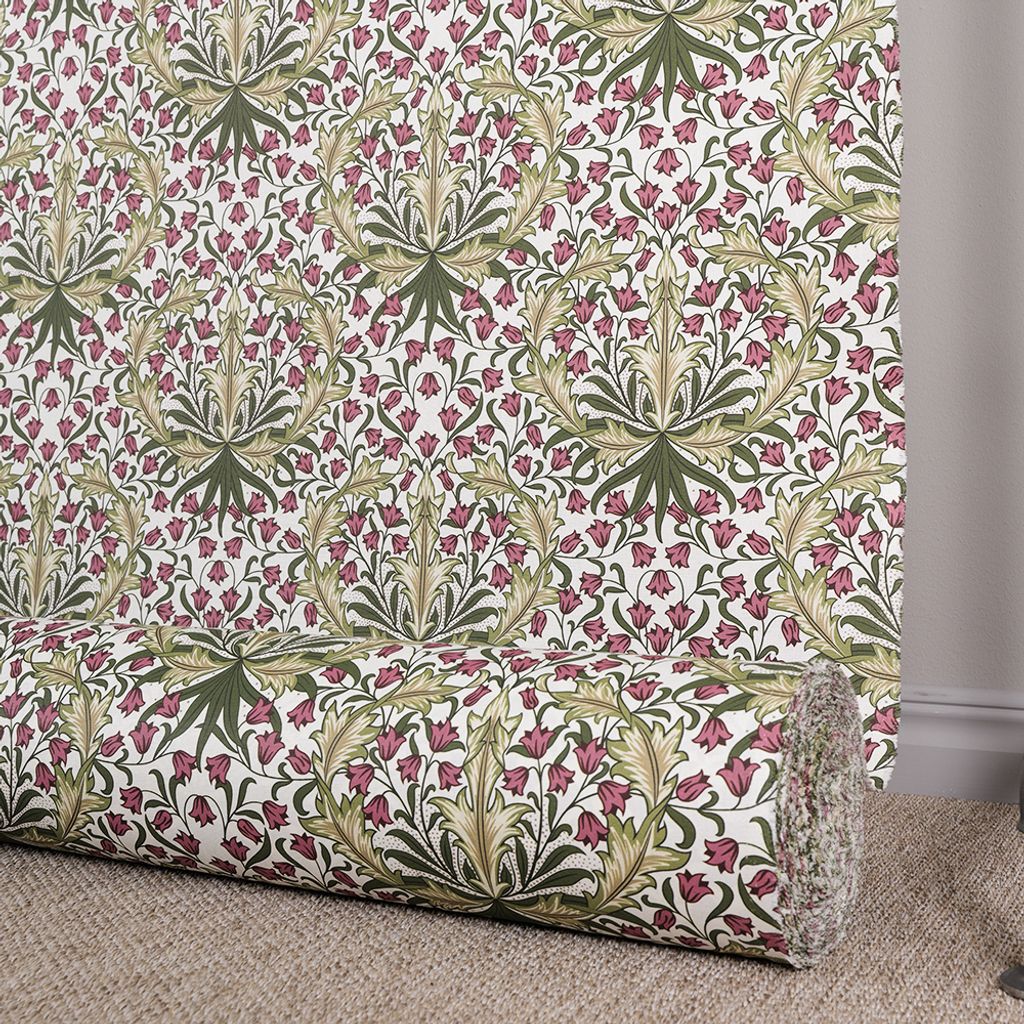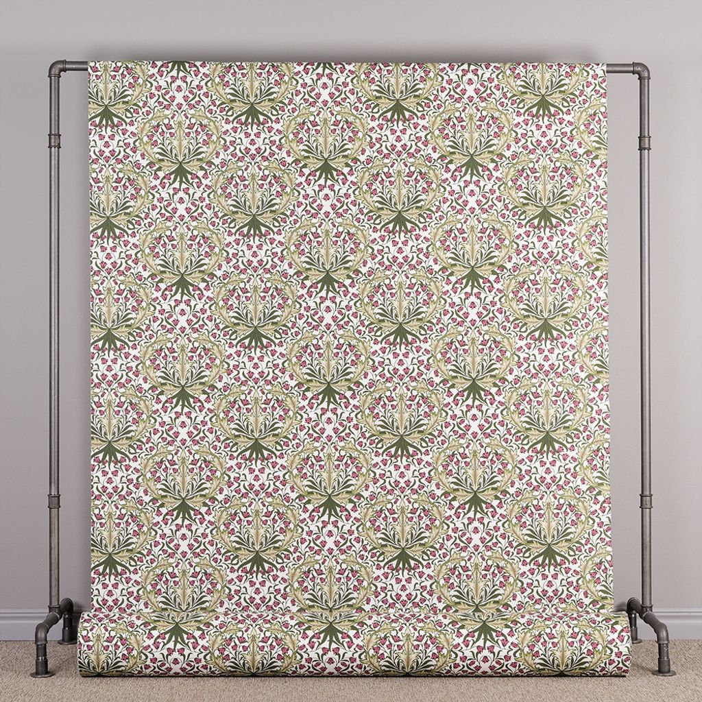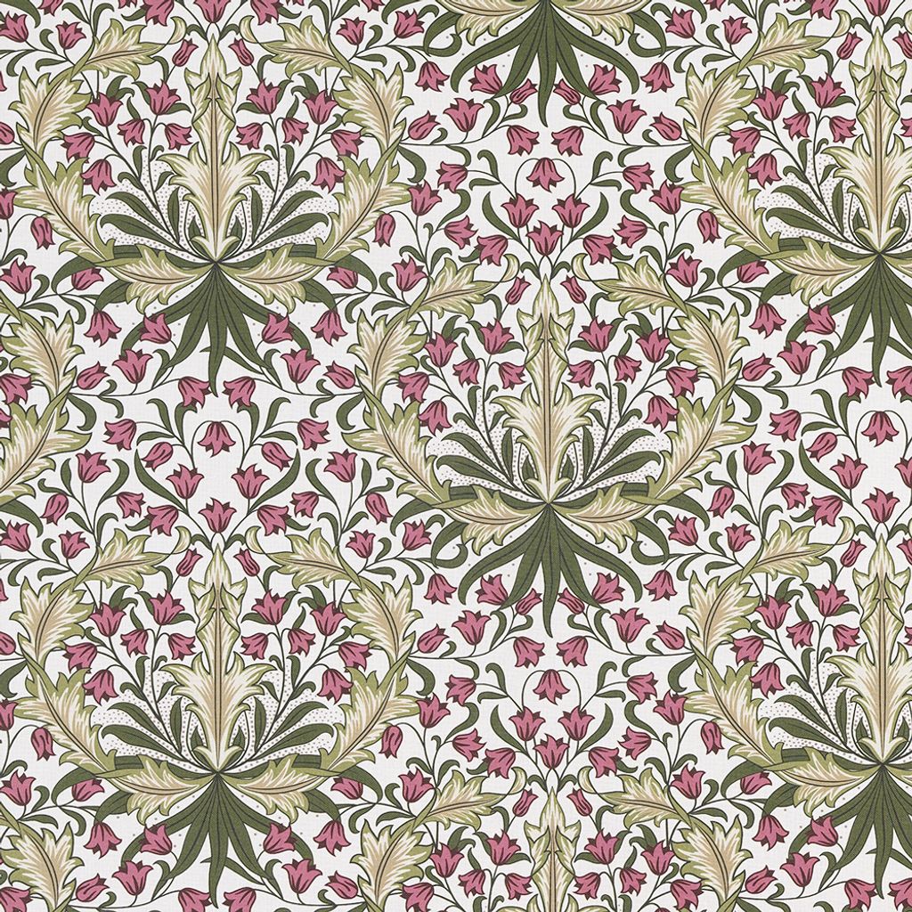 Willow Bloom är ett karaktärsfullt tyg i klassisk William Morris-stil, fyllt av sirligt tecknade blommor och bladverk i ett elegant återkommande mönster. Det detaljrika motivet består av vinröda och rosa klockblommor i kombination med stiliserade blad i olivgrönt och guldtoner, vilket skapar en varm och levande atmosfär.