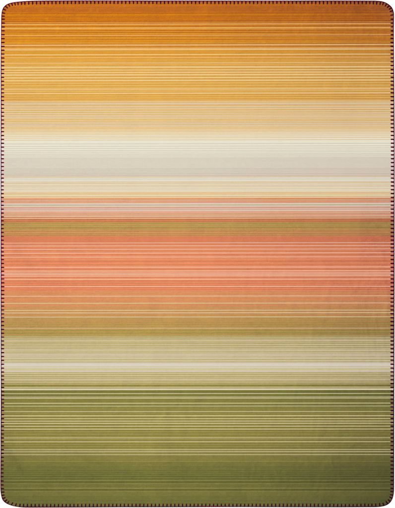 Filten har ett randigt mönster på ena sidan och en enfärgad, mörkare baksida som ger ett elegant och genomtänkt helhetsintryck. Den dekorativa blanket stitch-sömmen runt kanterna förstärker hantverkskänslan och ger filten en tydlig och ombonad karaktär.