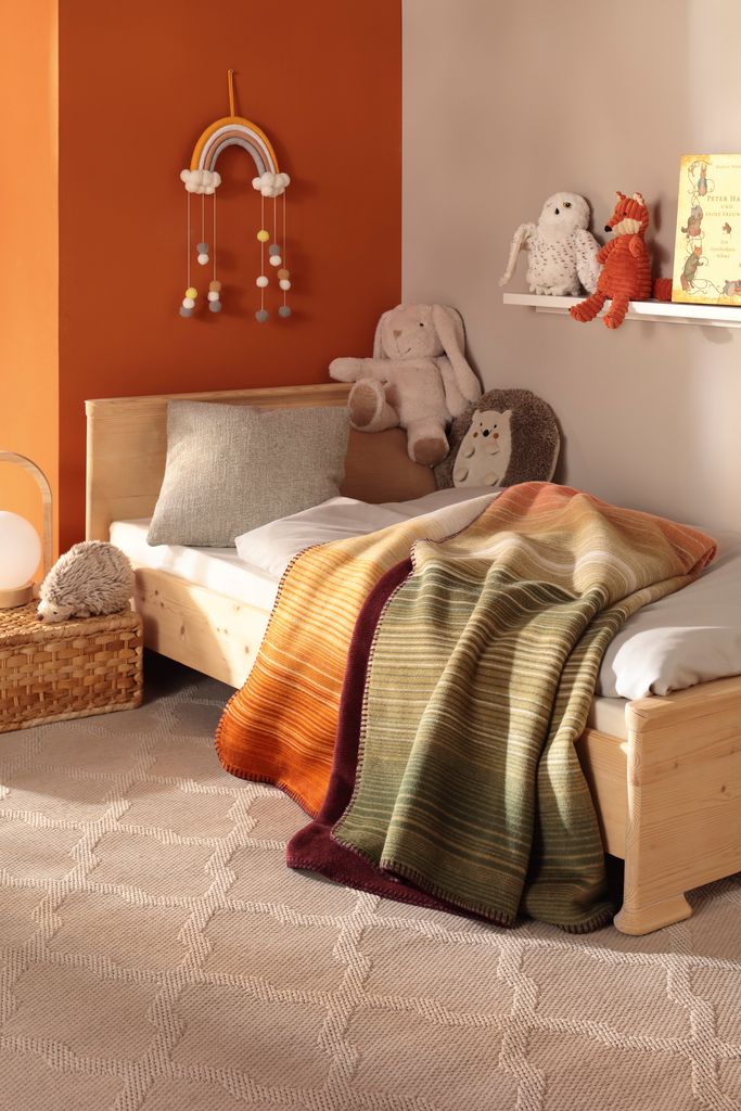 Woodland är en mjuk och harmonisk filt inspirerad av naturens egna färgskiftningar. Med sitt randade mönster i varma jordnära toner och kontrasterande baksida blir den en ombonad favorit i både vardagsrum och barnrum.