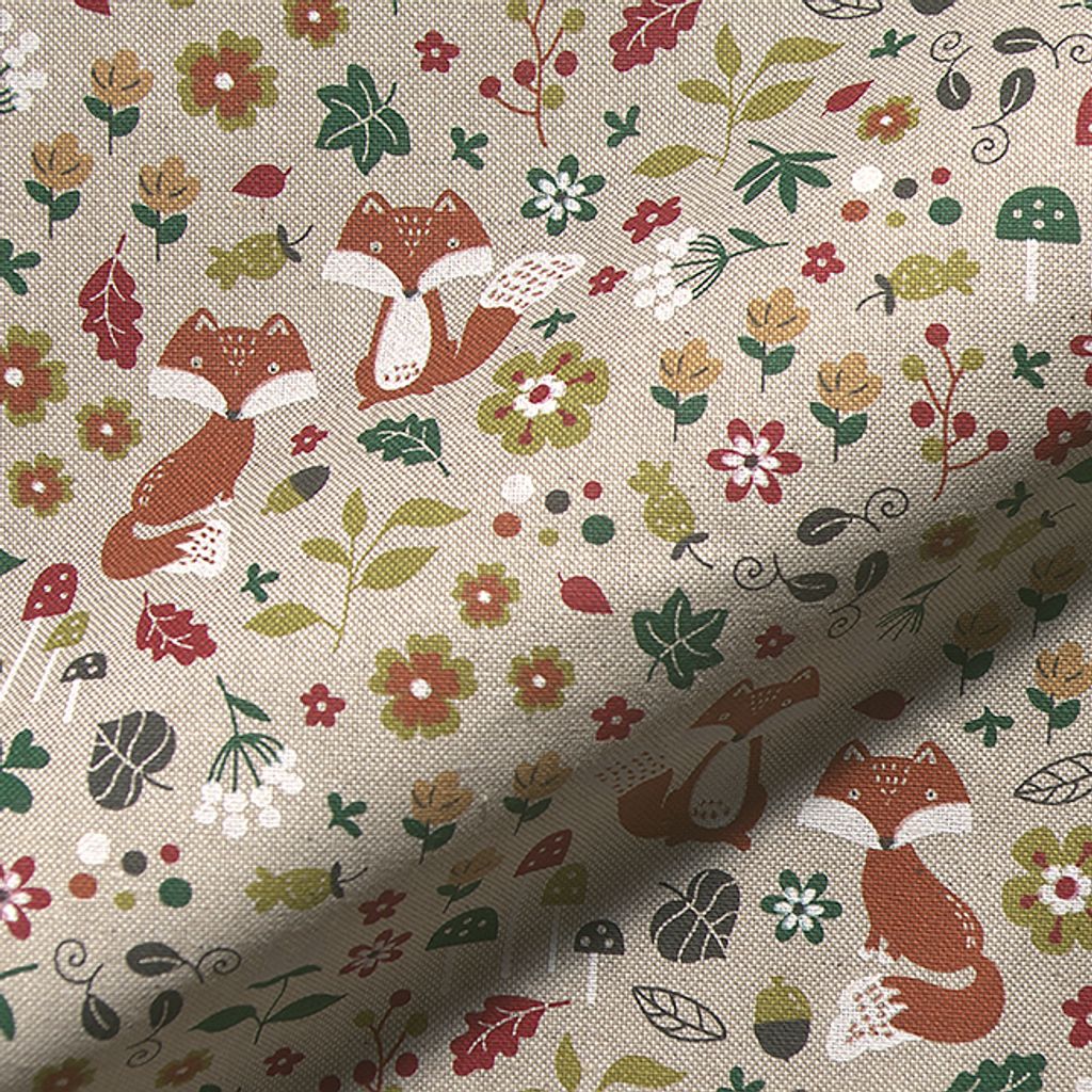 Tyg för gardiner och inredning med linnelock med söta rävar, blommor och löv.