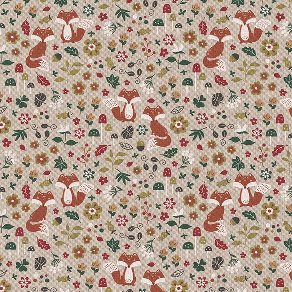 Tyg på metervara för gardiner och inredning med rävar, blommor och löv.