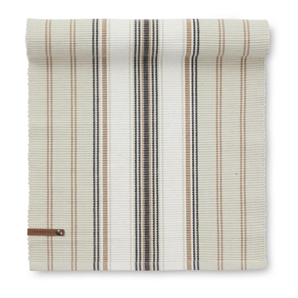 Wove beige är en elegant bordslöpare som kombinerar ett klassiskt randigt mönster med en mjuk och naturlig färgpalett. De bruna och mörka ränderna bryter fint mot den ljusa basen och skapar ett balanserat och stilrent uttryck som ger dukningen ett lyft utan att ta över helheten.
